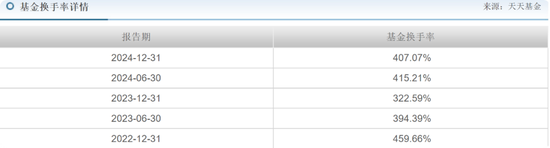 笔者发现,该基金的换手率较高,2022年4季度换手率高达459.66%,2024年2季度也高达415.21%,2024年4季度末换手率也高达407.07%。高换手率意味着频繁交易,这会导致投资组合的波动性增加。频繁买卖股票使得基金的持仓结构不断变化,难以形成稳定的投资组合。当市场出现波动时,高换手率的基金更容易受到影响,净值波动幅度可能会加大。