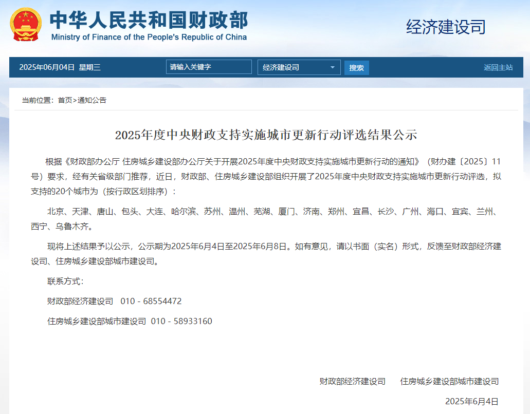 财政部今天(4日)公示2025年城市更新行动评审结果,北京、天津、唐山、包头、大连、哈尔滨、苏州、温州、芜湖、厦门、济南、郑州、宜昌、长沙、广州、海口、宜宾、兰州、西宁、乌鲁木齐等20个城市入围。