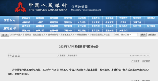 4月24日,中国人民银行公告指出配资网app官方最新版本介绍,4月25日(周五),中国人民银行将以固定数量、利率招标、多重价位中标方式开展6000亿元MLF操作,期限为1年期。